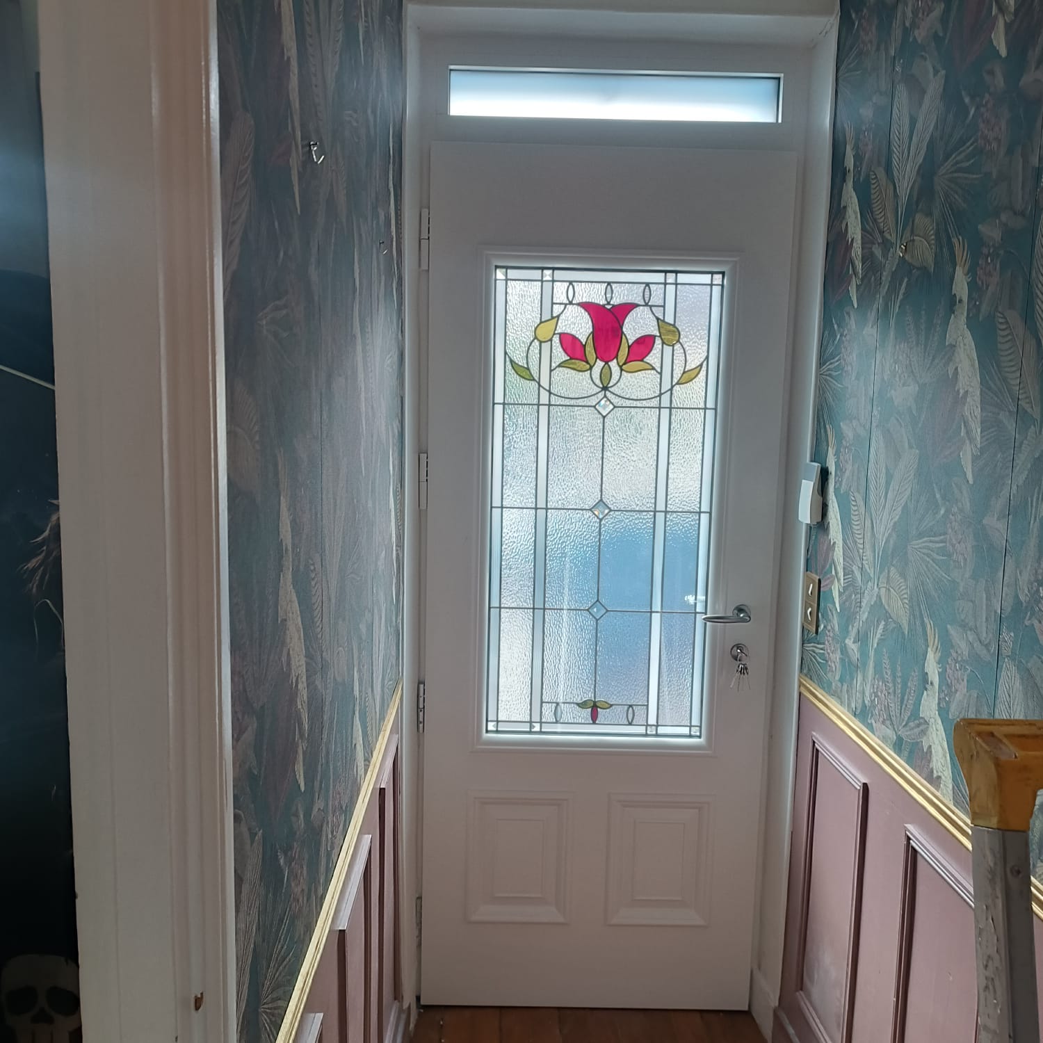 Cette porte est équipée d’un triple vitrage avec sérigraphie intégrée, apportant une touche décorative élégante tout en assurant une isolation thermique et acoustique optimale.